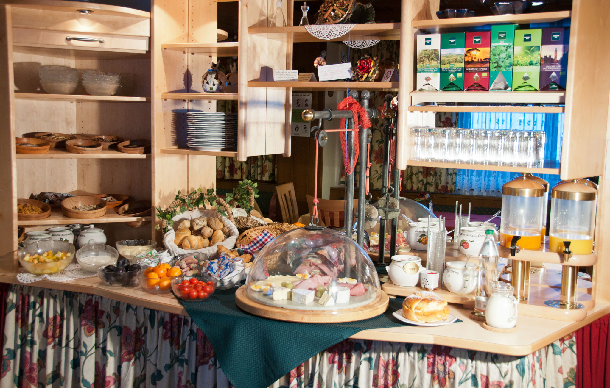 Wir verwöhnen Sie mit einem Vital- Frühstücksbuffet mit Bioecke und Produkten aus den Nockbergen.